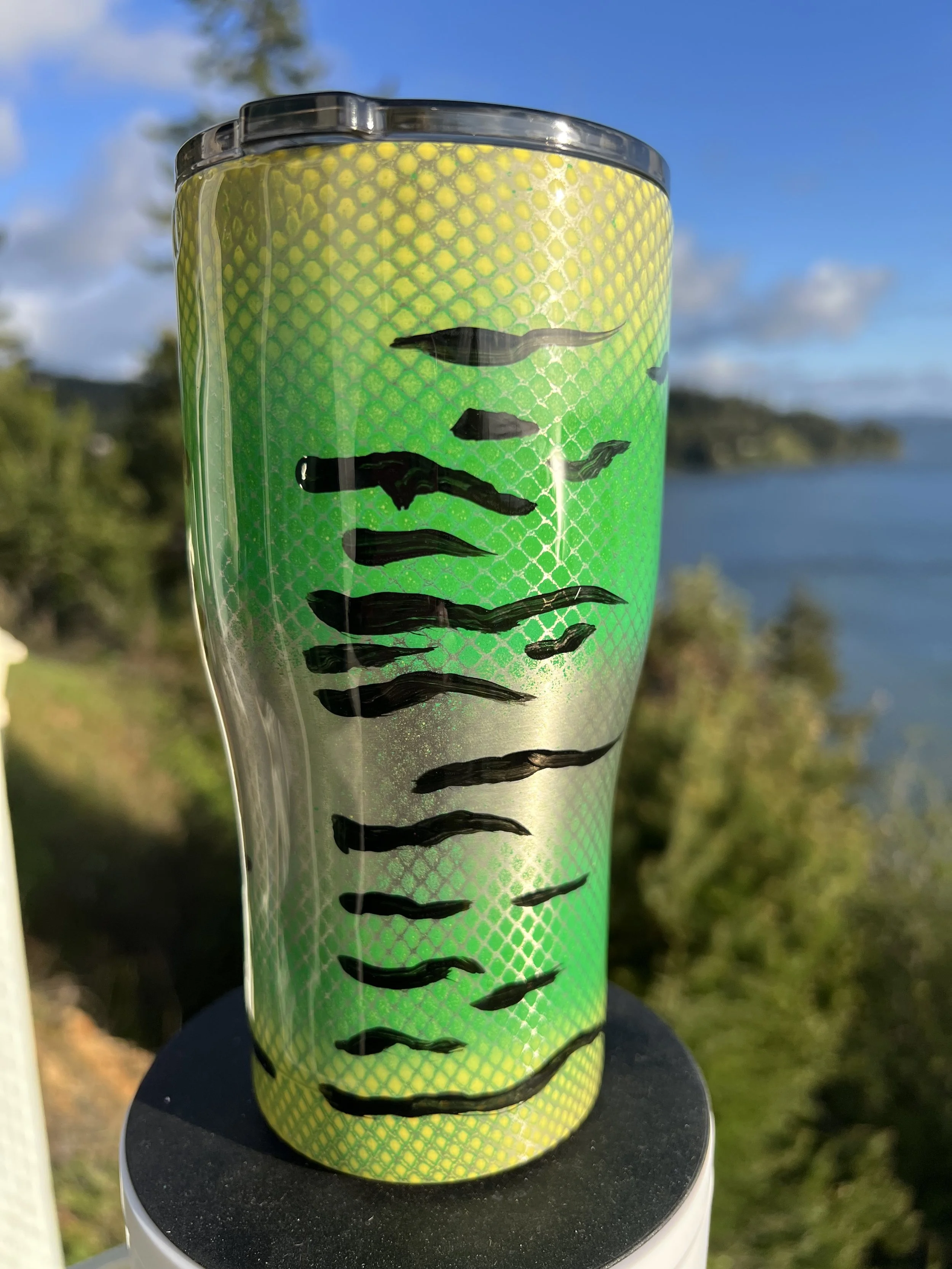 Sea Turtles swim around on this beachy vibe 30oz tumbler. Stainless steel construction keeps your drink hot or cold for many hours.